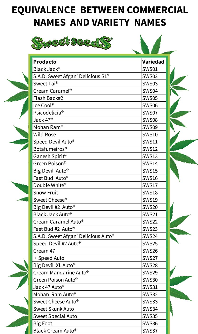 | Forums > ICMag Vendor Forums > Sweet Seeds > Equivalence between commercial names and variety names | ||