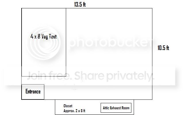 I've been planning my grow for a long time now and have FINALLY come to the conclusion that since I'm dedicating a full 10.5 x 13.5 bedroom to my grow, there is no reason not to go vertical (special thanks to krunchbubble and your awesome threads for the inspiration). At the moment, I'm vegging a good amount of clones/mothers in my 4x8 veg tent that will continually feed this room. The 4x8 tent will be sitting in the room, which leaves me give or take 100 square feet of usable space to flower in the room. I'm going to be running 3 x 1000w hortilux hps bulbs. In my veg tent I'm running a 400w mh and an 8-bulb T5. I'm hoping some of you vertical experts could help me draw up a great plan that will not only be efficient but will put out consistent results without the constant work such as training and bending like you would in a horizontal scrog. That being said, here is a little sketch of the room we are working with: ![]() So far I have been tossing around three different set-ups...but that doesn't mean I am ruling anything out. I simply want the best yields and fattest frosty nugs that I can get with simplicity and efficiency. I plan on handwatering in coco using a water wand...but I am open to setting up drippers as well. Idea 1 Hang 3 bare 1000w hortilux hps bulbs surrounded by 10-12 plants that have been vegged for about 1 month for a total of 36 plants. The reasons I like this is I can pretty much throw any size of plant in there, hand water it, rotate it, and know I'd be getting good yields if my temps and such are set. What I don't like about it is that I've been seeing the best yields in vertical systems with 360 or stadium styles and/or the heat could turn into an issue if I'm not running A/C. Idea 2 Hang 3 bare 1000w hortilux bulbs in the middle of a four-level stadium. The stadium would be built out of racks so that I could just sit the 2 gal grow bags of coco on top of the racks and have super simple and clean drainage. I would probably put 6-8 plants that have been vegged for 2-3 weeks on each level, for a total of 50-60 plants. **I've also tossed around the idea of stacking the bulbs in a stadium style but if stacking it seems that 360 would be the only way to go?** Idea 3 Build a square 360 room with 3 shelves. Each shelf would be built like a foot wide with a 8-9" panel to support the front of each plant so they don't topple over when they grow bigger and towards the light. The shelves would be angled so that each plant would be leaning towards the bulbs set in the middle. I feel like this set up could get me the biggest yields because each plant would almost be automatically scrogging itself. I feel that it would be ideal to stack cool tubes so each level could get its own dedicated 1000w, but if I don't run cool tubes I would probably try to set up the bulbs on some kind of adjustable levels where I would rotate them every third day so that there is even light distribution on all 3 levels. I'm really a complete newbie to vertical so any suggestions from you guys on how to use this space properly would be more than appreciated. I will be running CO2 and I have an A/C that I would like to avoid using since I think the ambient temperatures here in Santa Cruz are cold enough except during Summer, but I may be wrong and A/C might be a must with vertical unless I'm doing cooltubes? I'm hoping to not have to go buy 3 new cooltubes this round unless completely necessary. Anyways, I'm stoned and tired so I'll probably find myself rambling too much if I don't end this here. Thanks all in advance for any help or even for clicking on this thread