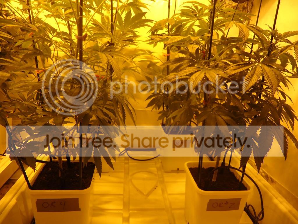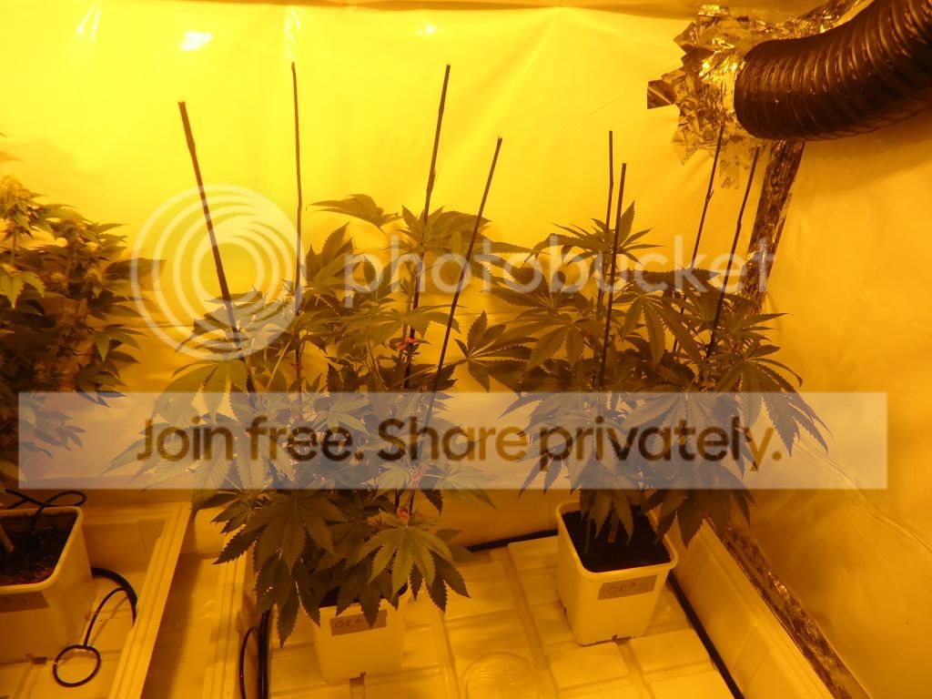 Today is 11/19 First day of flower for all 4 plants . they sit in a 3 x 3 flood tray on the floor . they're fed from an 18 gallon rez by a 250gph pump ... 1/2" lines to 2 1/4" drippers per pot . the runoff is sucked out of the tray everynight with a bucket head vac .2 gallon pots of canna coco DTW using HR's veg&bloom at different strengths for different stage plants mixed in RO/DI water .