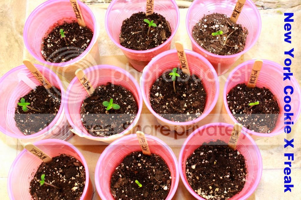 Here are the NYCookies X freak at a little over a week above ground, all seemed to be doing well working on their second set of true leaves. One thing that I notice is the "serrations" of the leaves, very deep/ridged. I like em! Having never grown GSC, Jones, AG13, ect.. I dont have anything to go by to tell me where they might get this from, but never the less very exciting. [IMG] [/IMG]Here is a close up, notice the deep purple on this part of the stem 8 out of 10 have this and are identical just showing in that spacing between nodes, is it a trait of parents or environment? Either way, very interesting! [IMG] [/IMG]